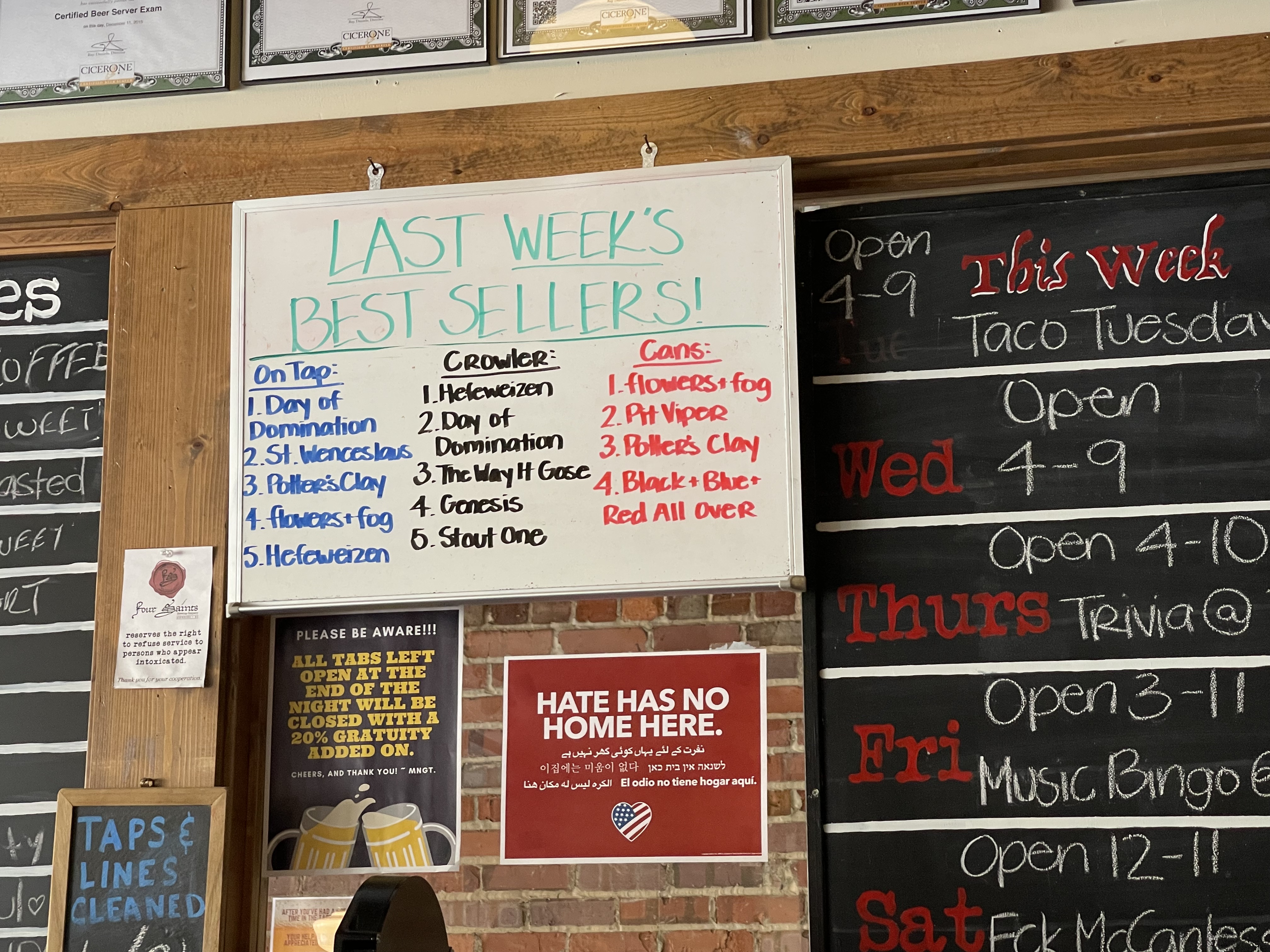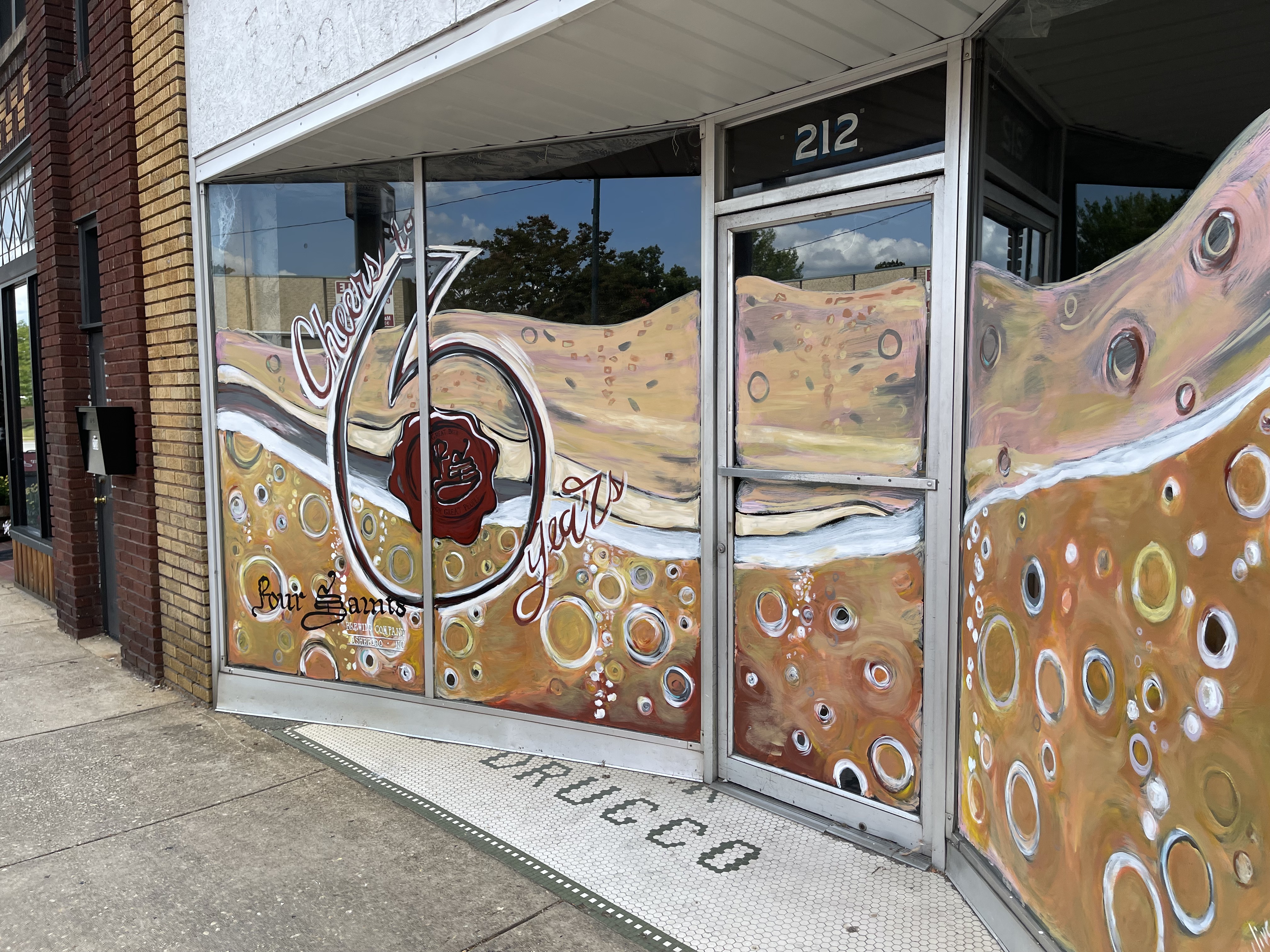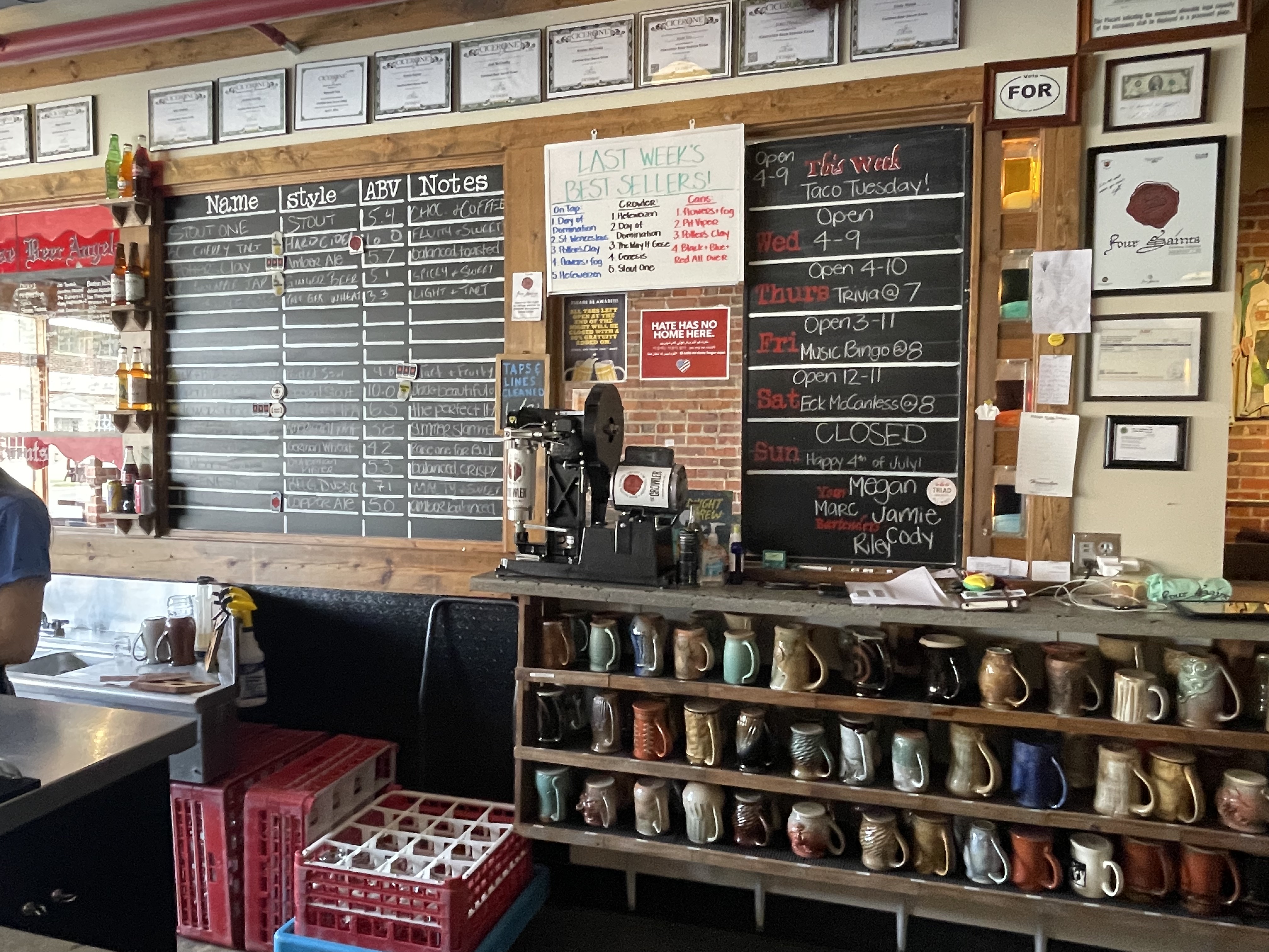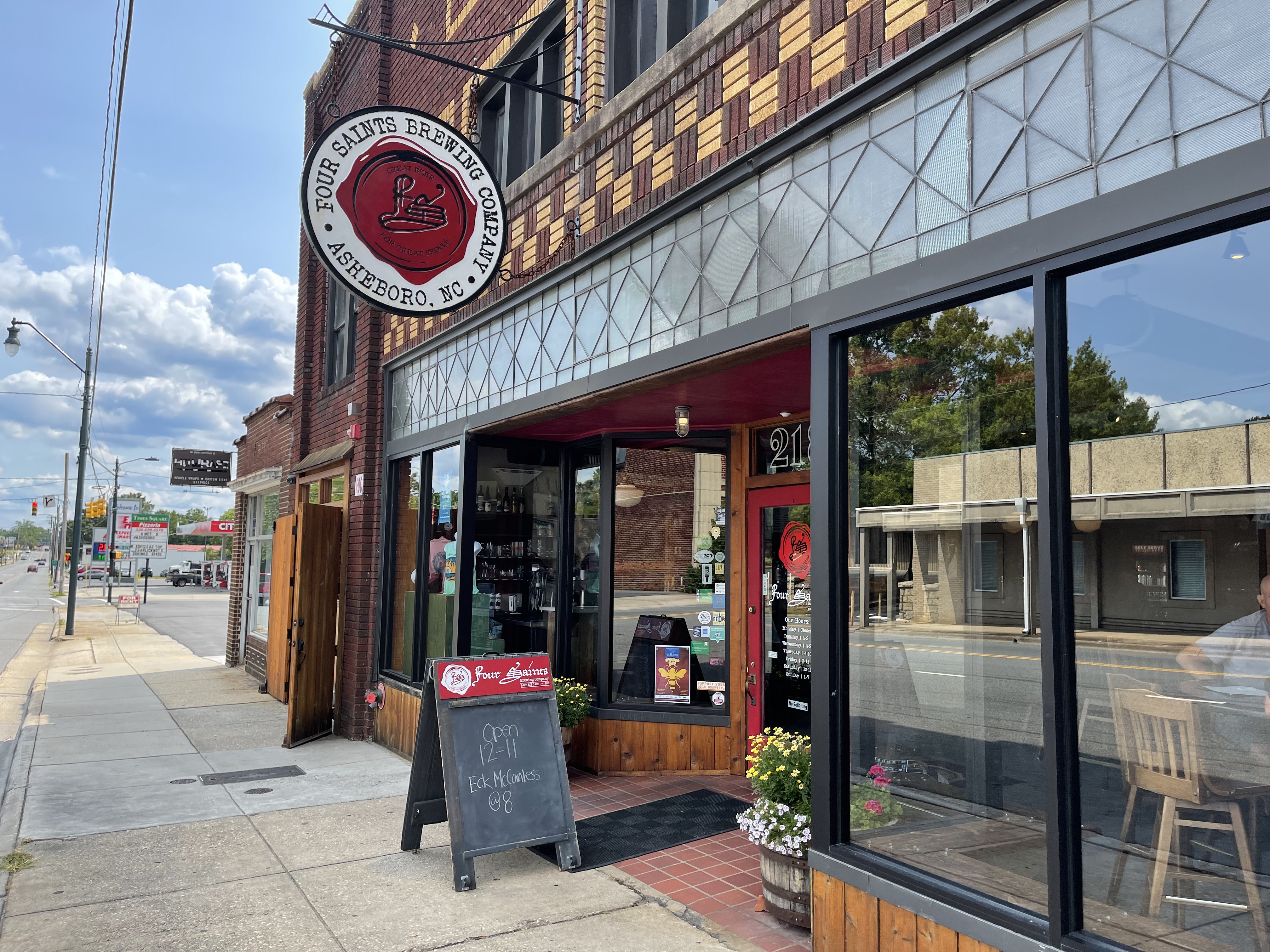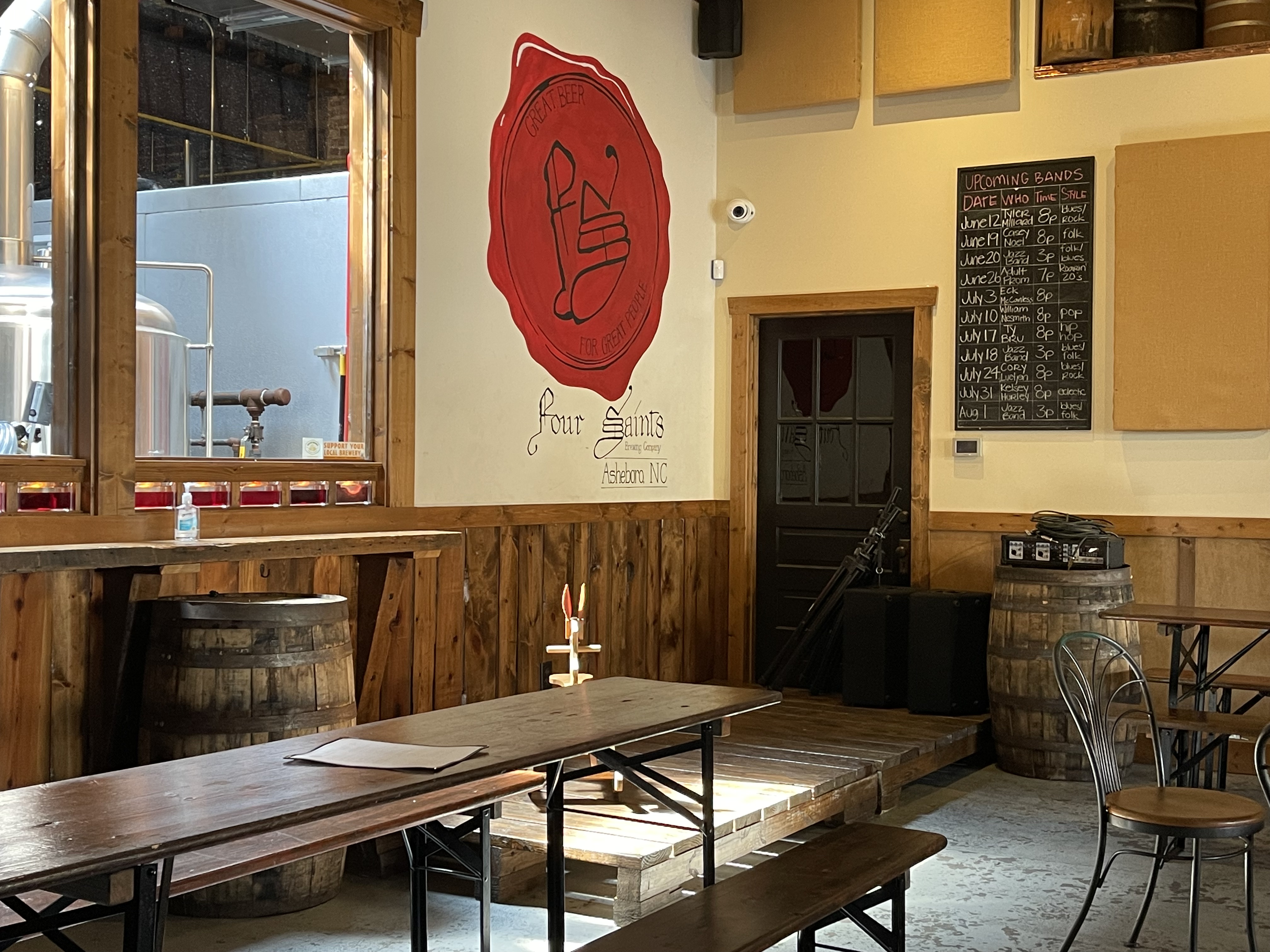 Four Saints Brewing Company is located in downtown Asheboro North Carolina. It features a large wraparound bar and lots of indoor seating. They offer flights of four, a selection of shirts and cans are available as well as crowlers to go. There is a small stage with a band schedule posted.