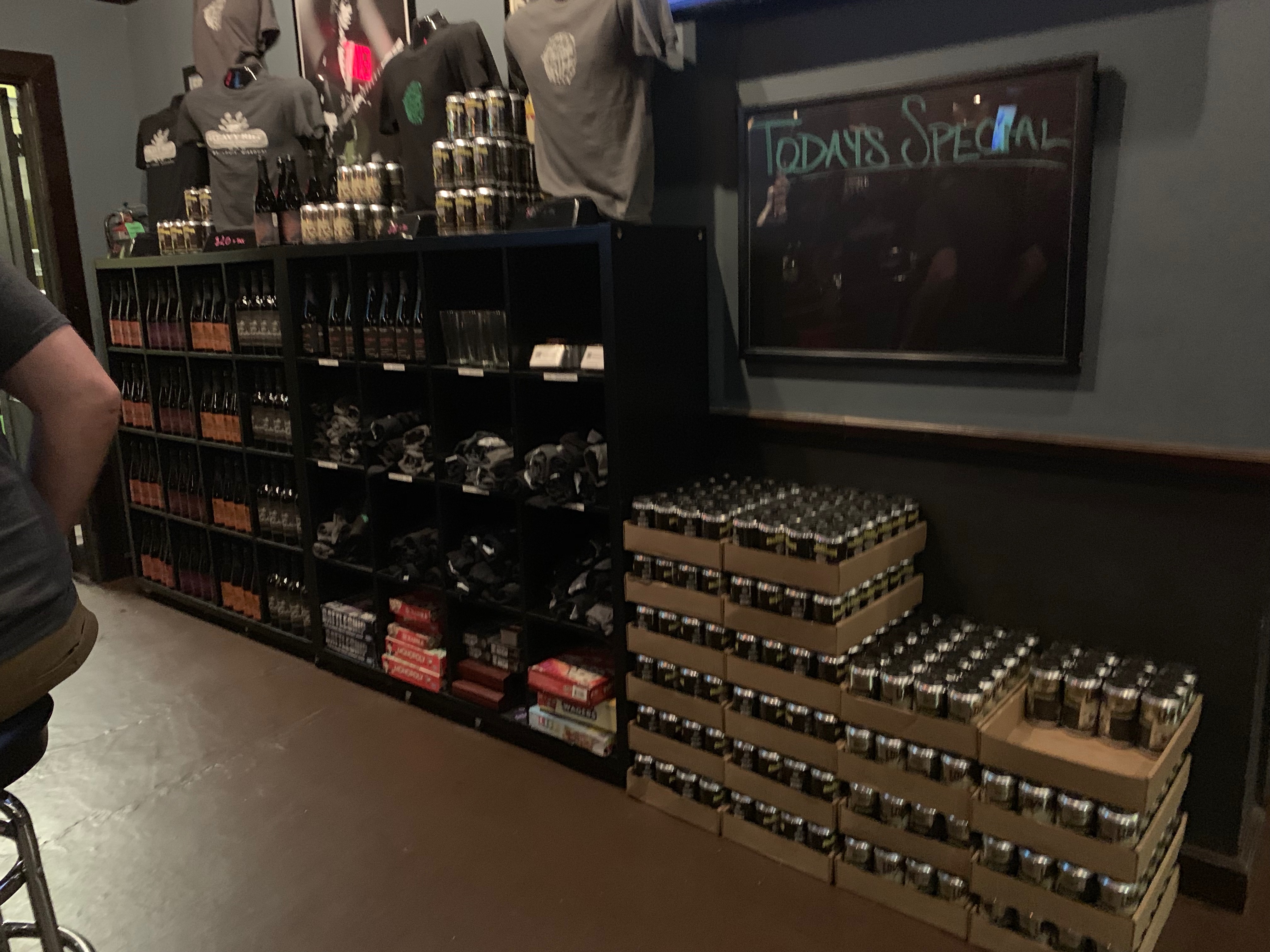 Windowed view of brewing operations. Full kitchen— sandwiches, wraps, salads, chili. Flights of 4 5oz pours available but exclude barrel aged sours (for which they specialize). Shuffleboard and 4 televisions for entertainment. Decorated with guitars and framed concert posters. Shirts for sale. Large selection of bottles and cans to go as well as crowlers (limited selection).
