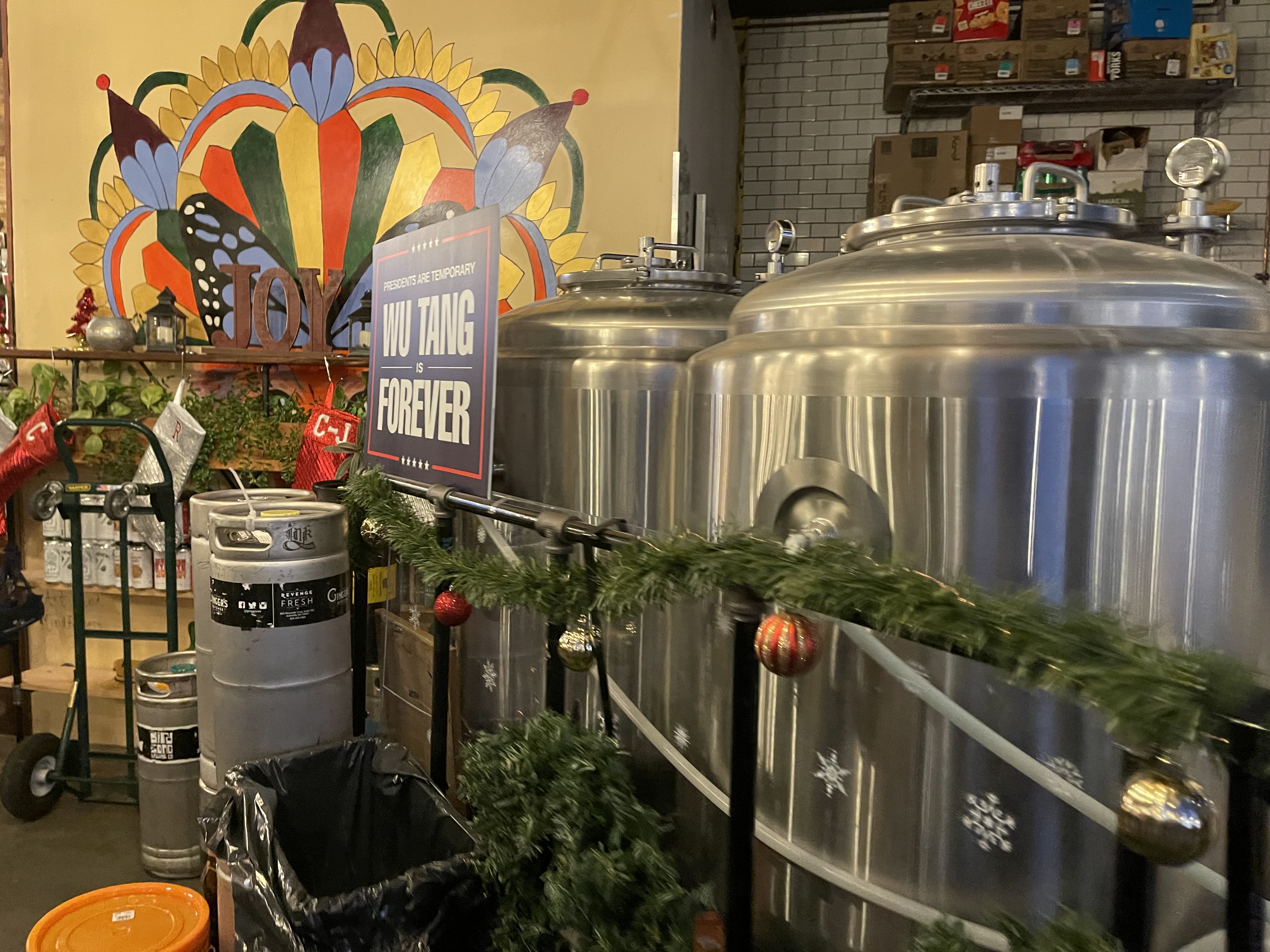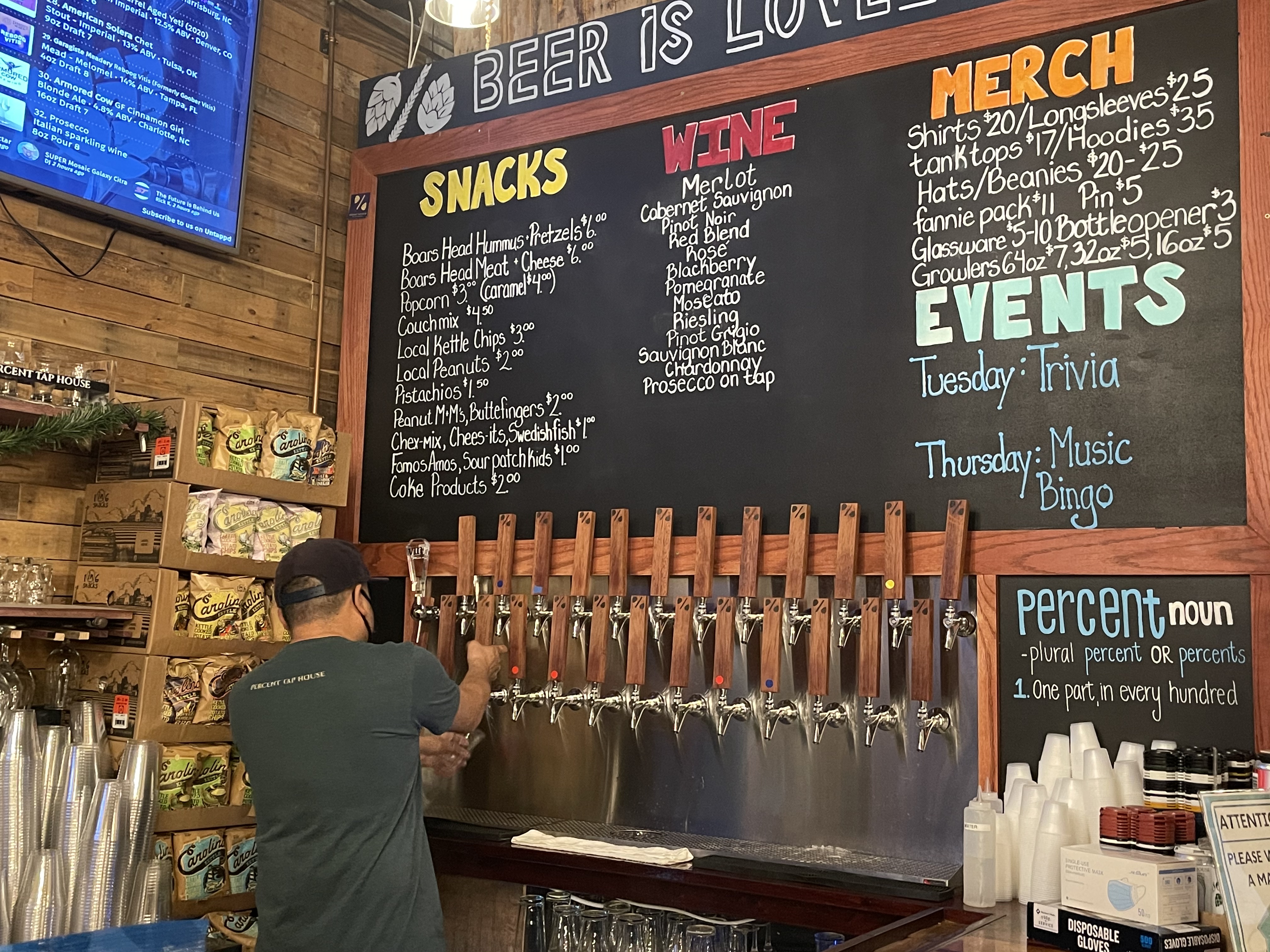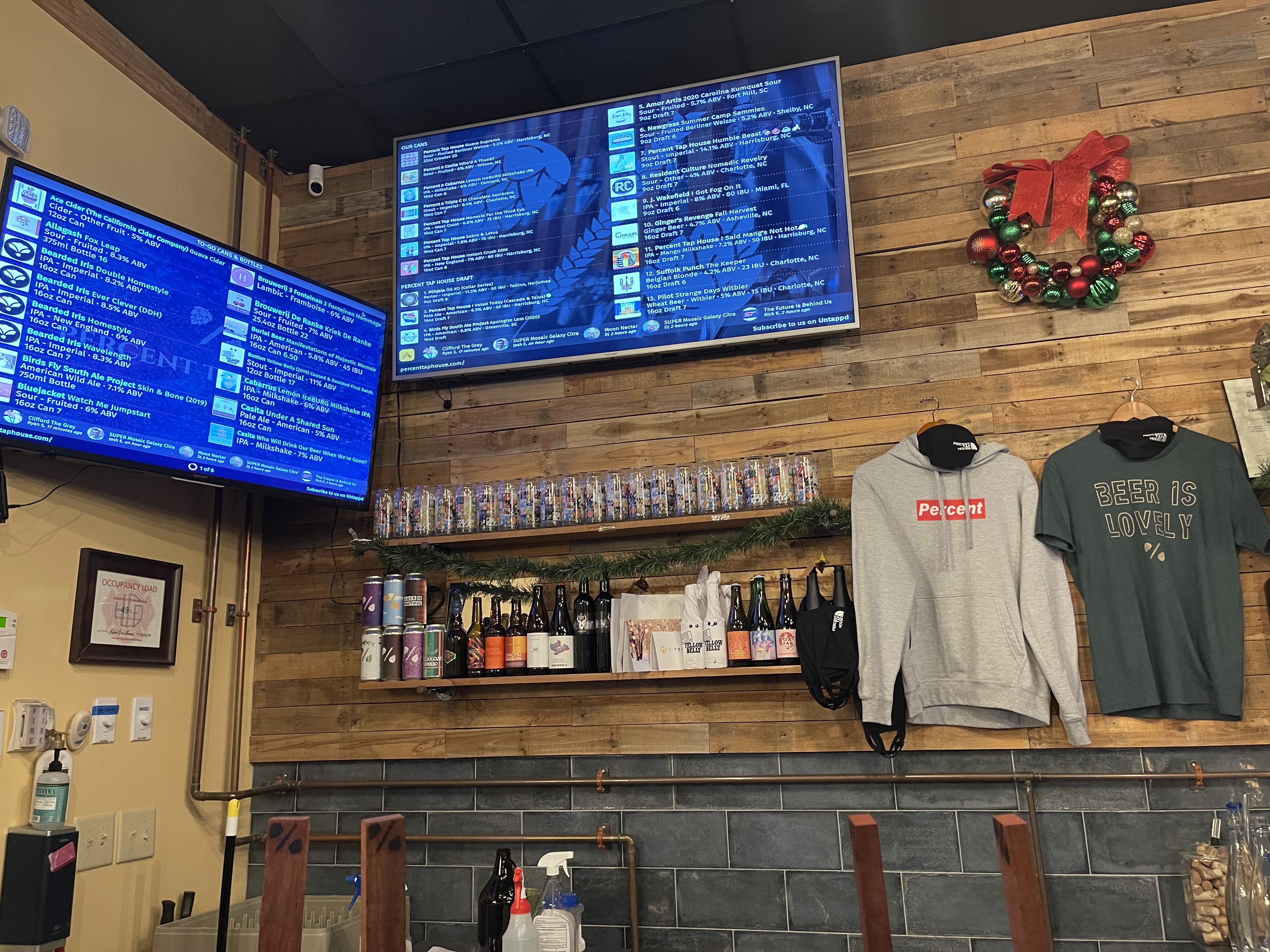 A fair selection of bottles bad cans to go are available, cans refrigerated (discounts on 4 or 6 packs). Merch includes hats, shirts and sweatshirts. Local art for sale dawns the walls. PlayStation gaming area provided.